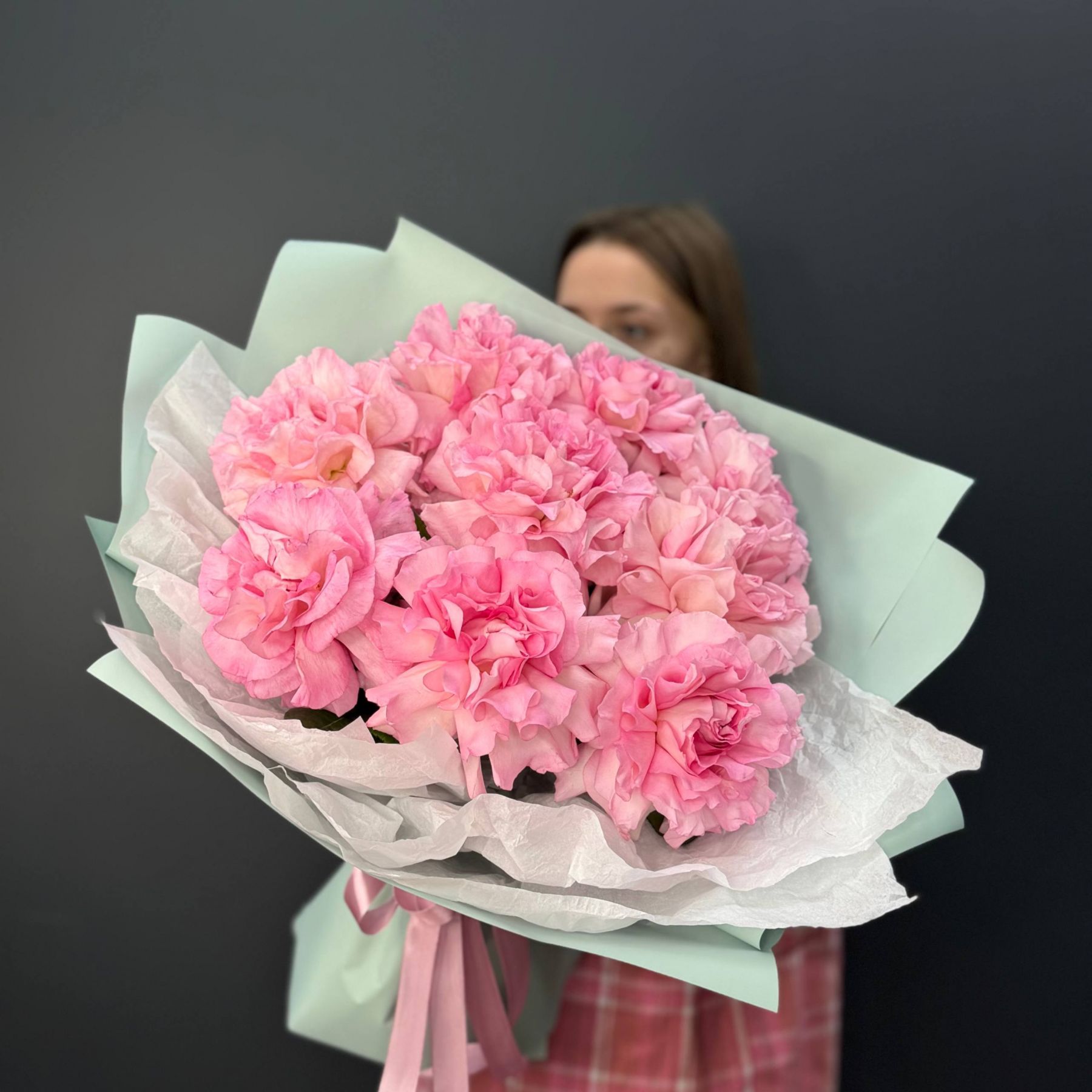 Букет из 9 нежно-розовых французских роз в мятной упаковке